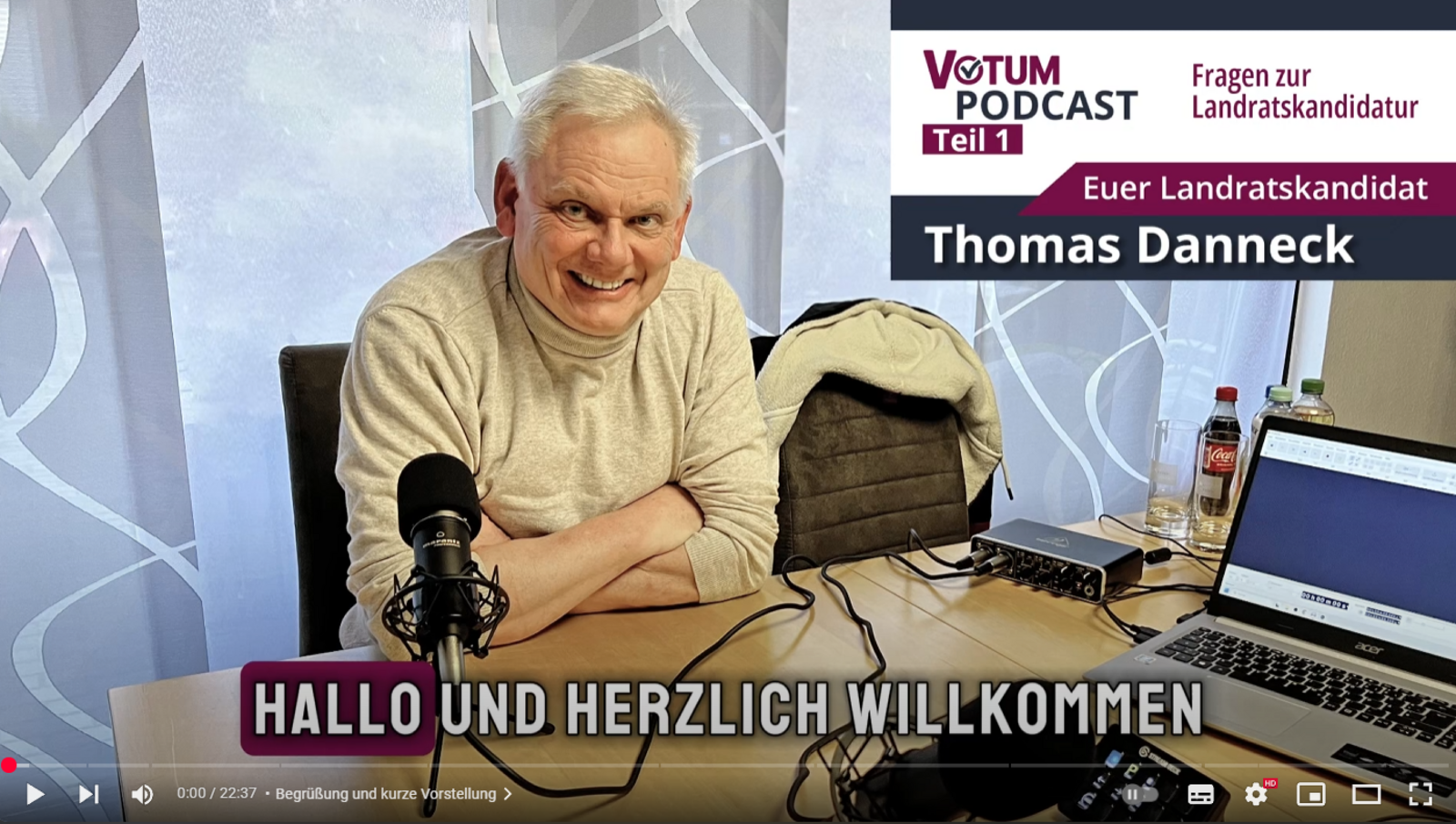 In der ersten Folge des VOTUM Podcasts spricht Thomas Danneck über seine Motivation, den Wahlkampf-Alltag, wirtschaftliche Herausforderungen im Kreis und die Themen, die den Bürgerinnen und Bürgern aktuell am meisten unter den Nägeln brennen. Außerdem gibt es persönliche Einblicke und eine unterhaltsame Fragerunde!